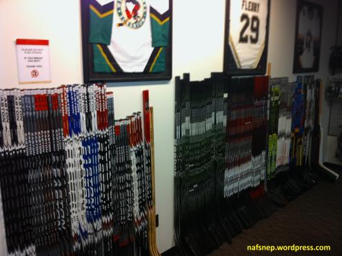 Take a few steps forward and look to the right and there is this. A wall of sticks. These are all for sale. The ones on the left are not issued for the players (I think they call them pro stock) the ones on the right are in fact players sticks. Very cool. (No, the framed jerseys are not for sale)