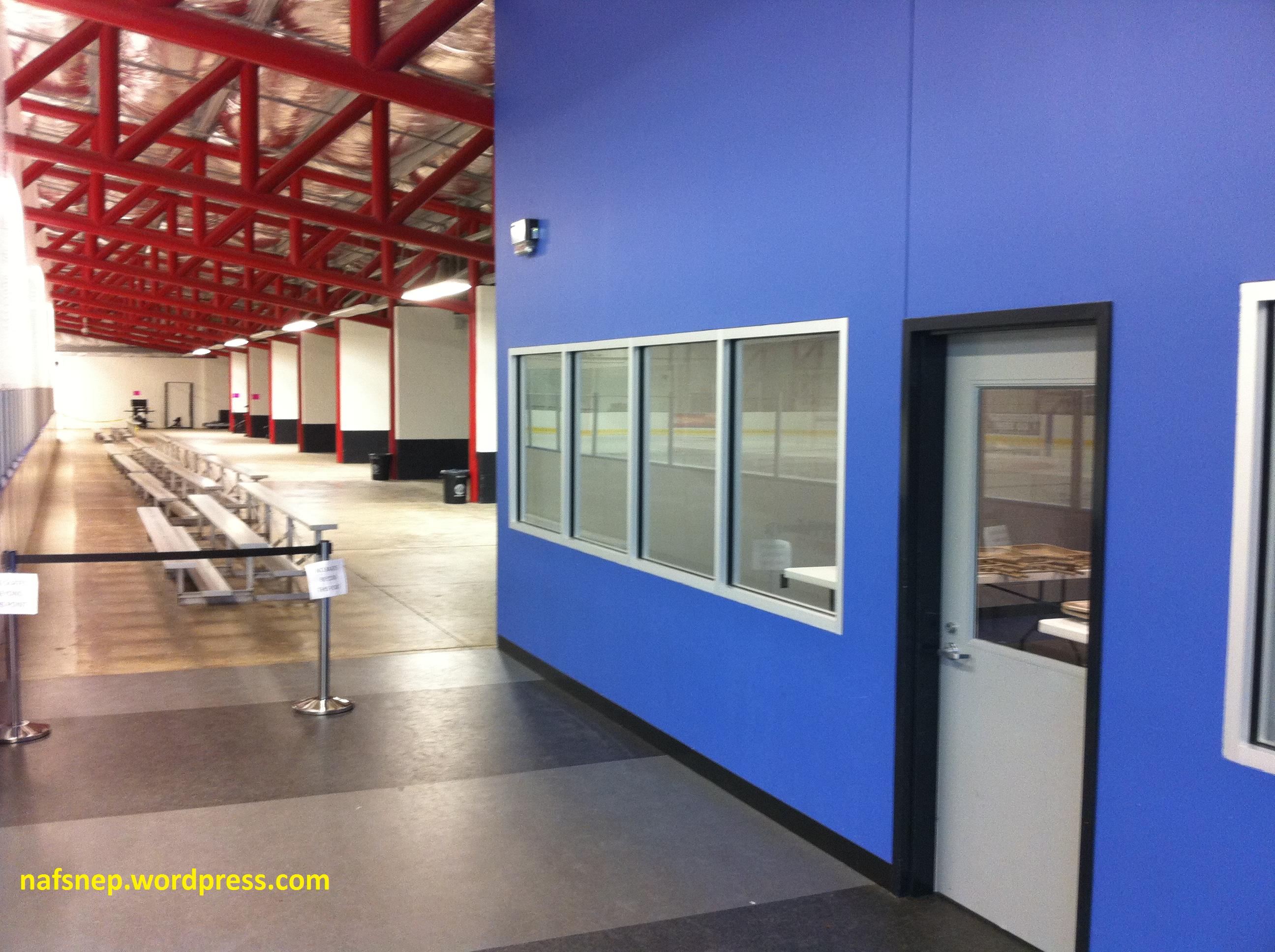 Step thru the doors from the lobby area and the practice rink is here. Below is the hallway. You can’t walk around the rink, as there are no bleachers on the other side. In those cubbie holes are weight equipment. In the office looks like a meeting room. I didn’t spot any whiteboards or TV equipment so I don’t know what the Penguins have in store.