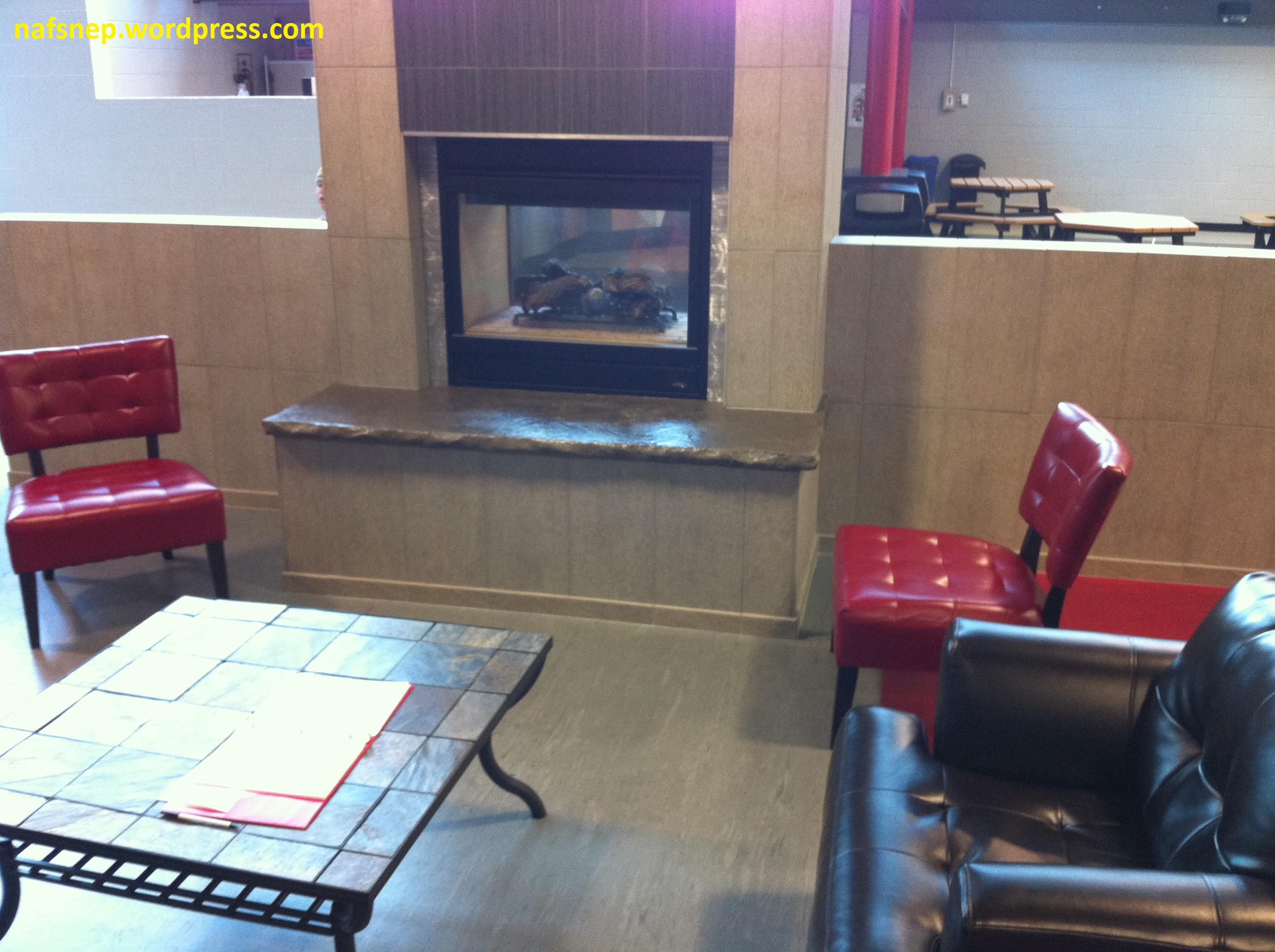 Fireplace and comfy chairs. At the time I took this picture there were people to the left of me chatting about important hockey stuff, so I didn’t want to ask them to move. It’s a nice setup.