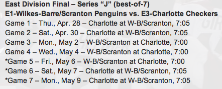 Games 1 and 2 in the East Division Finals will be Thursday and Saturday in Wilkes-Barre. The rest of the schedule will be put out by the League this week.