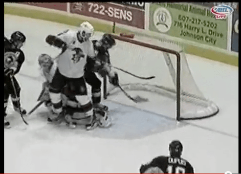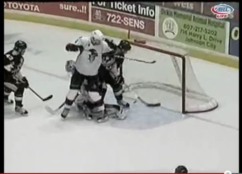There is certainly no doubt that Tangradi is in the crease. It looks like from above that Cowen is “boxing in” Tangradi. Here’s where I think referee Dave Lewis interpreted this as goaltender interference. It’s Rule 69 from AHL Rulebook which you can find from the Bombulie postgamer I linked to above.